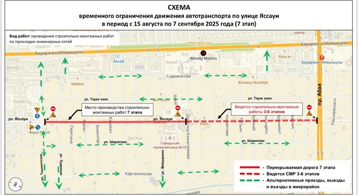 В связи с проведением строительно-монтажных работ по прокладке водопроводных и канализационных сетей в микрорайоне Достык, в период с 15 августа по 7 сентября 2025 года будет осуществляться полное перекрытие движения по улице Яссауи, - передает Almaty.tv.