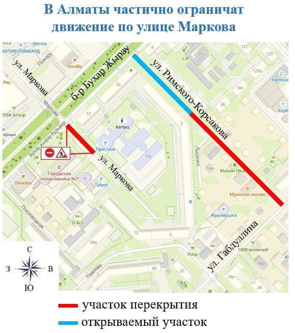 В связи с этим с 3 июля по 25 августа 2025 года в Бостандыкском районе города Алматы будет закрыто движение автотранспорта по улице Маркова - на участке от бульвара Бухар Жырау до детского сада «Зайка». Движение будет закрыто в обоих направлениях.