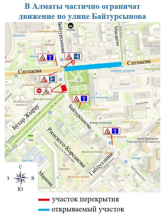 Движение по улице Сатпаева на участке от улицы Масанчи до улицы Байтурсынова восстановлено. В период проведения работ проезд на пересечении улиц Сатпаева и Байтурсынова останется открытым.
