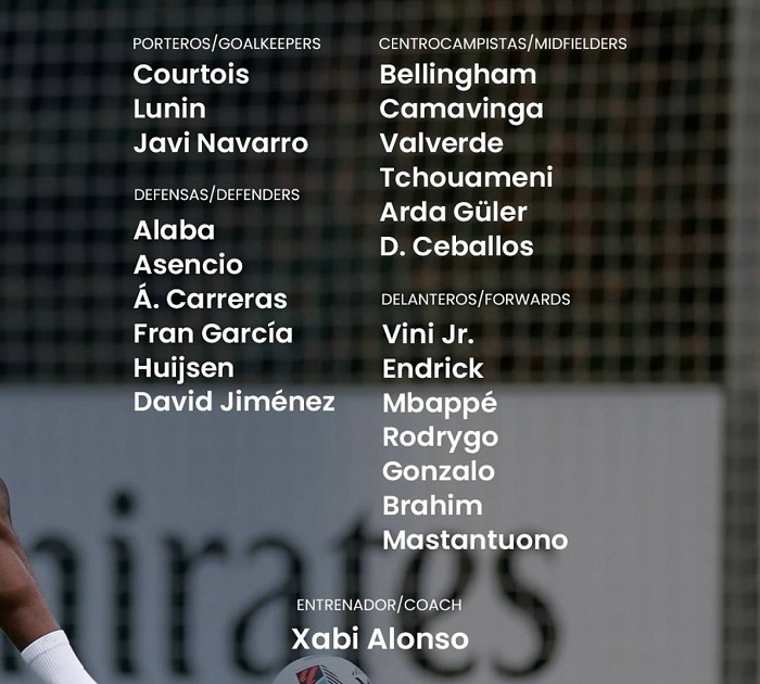 Список игроков был опубликован на официальной странице мадридского клуба в Instagram. В заявку на игру вошли 22 футболиста, включая шестерых защитников. Отметим, что капитан и основной правый защитник команды, самый титулованный игрок «Реала» Дани Карвахаль, получил травму и не сможет принять участие в матче с «Кайратом». Также в составе отсутствуют Трент Александер-Арнольд, Эдер Милитао и Антонио Рюдигер.