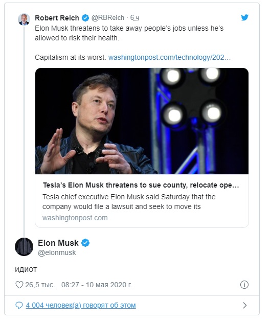 "Идиот", - добавил Маск, перейдя на русский язык.