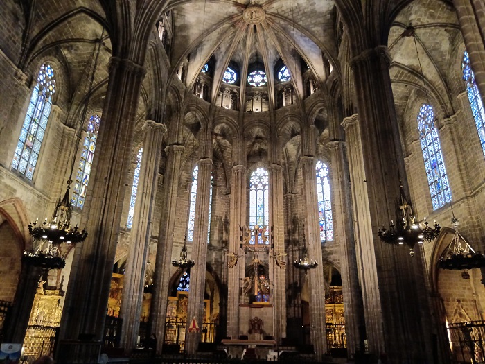 Внутри собор соответствует всем средневековым канонам: огромные витражи, 25 молелен, алтарь XIV века, под которым есть вход в часовню с останками Святой Евлалии.